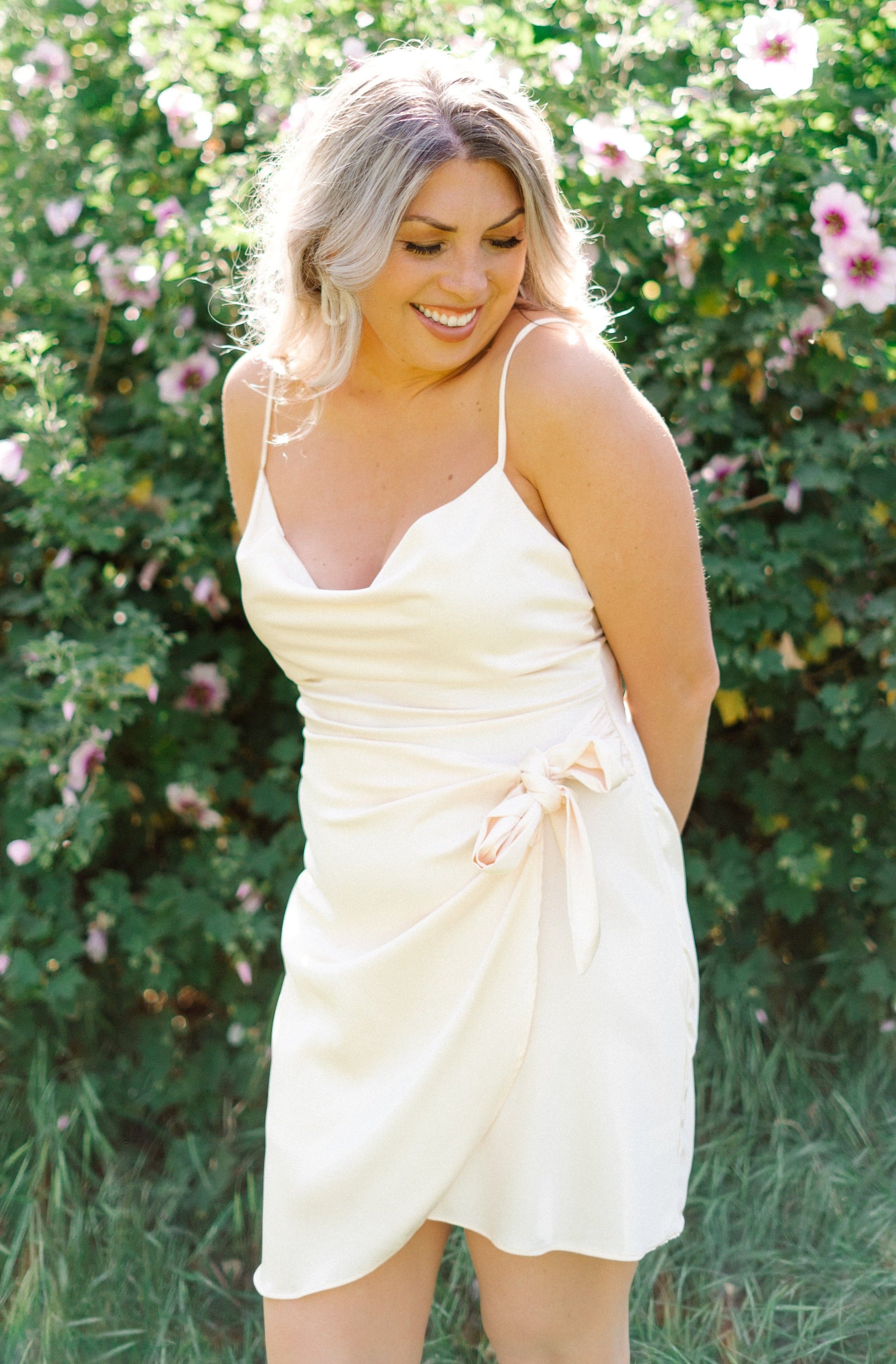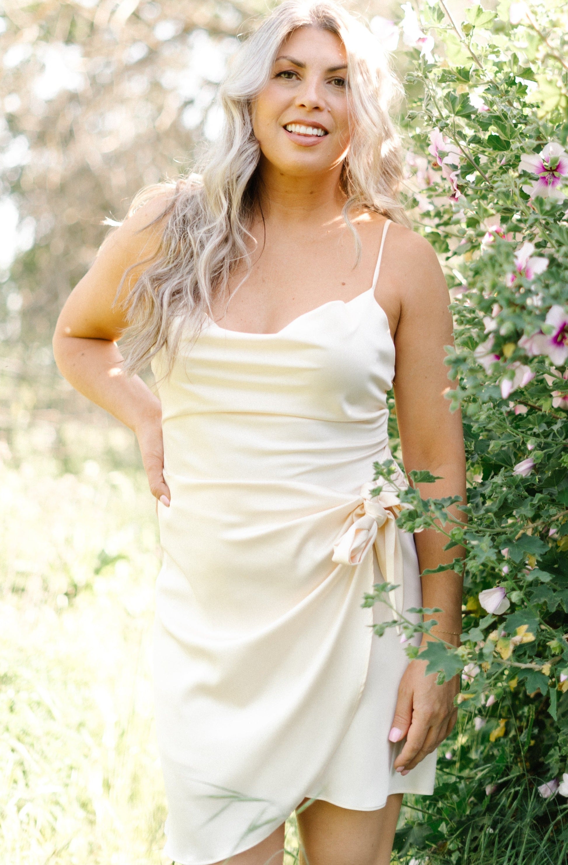 This Love Potion dress will cast a spell on any onlooker. With its cowl neckline, adjustable straps, and self tie wrap skirt, you'll look stunning and feel glamorous. The pleated details and lush champagne hue make this satin mini dress a gorgeous choice for your next special occasion!
